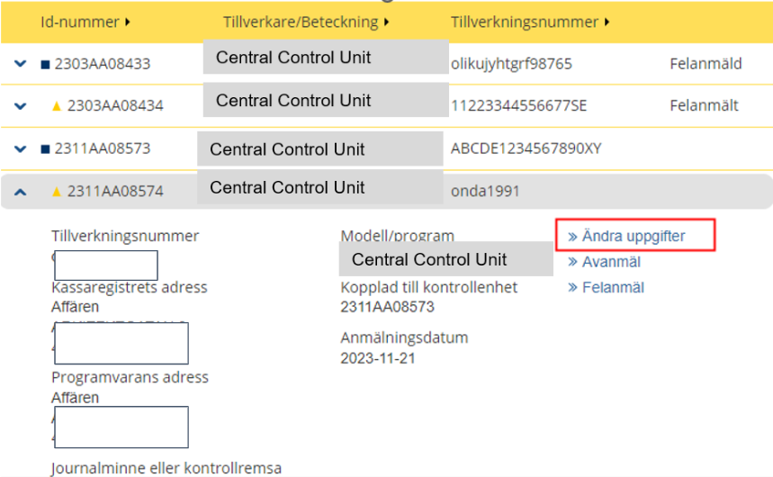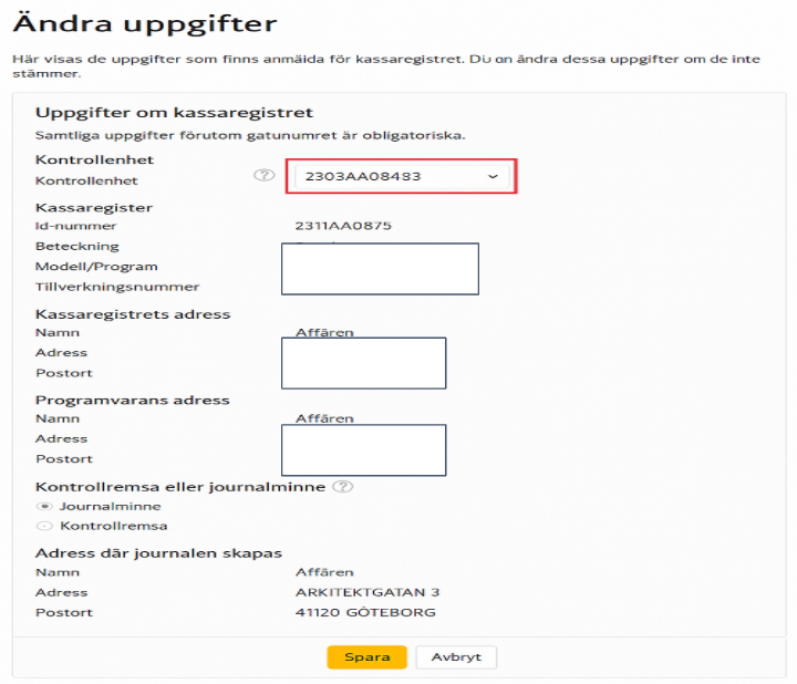 Klicka på "Ändra uppgifter" för att öppna formuläret där du kan ändra uppgifter om kassaregistret t.ex. vilken kontrollenhet/kontrollsystem som kassaregistret är kopplat till.