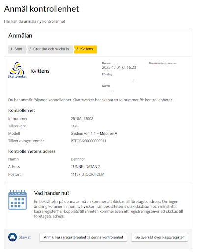 I det sista steget visas en kvittens, vilket är en sammanfattning av all information du har lämnat och en bekräftelse på att Skatteverket har mottagit din registrering.