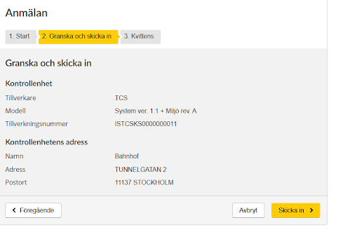 När du klickar på "Nästa" kommer du till nästa steg där du granskar och skickar in informationen. Om allt är korrekt klickar du på lnappen "Skicka in".
