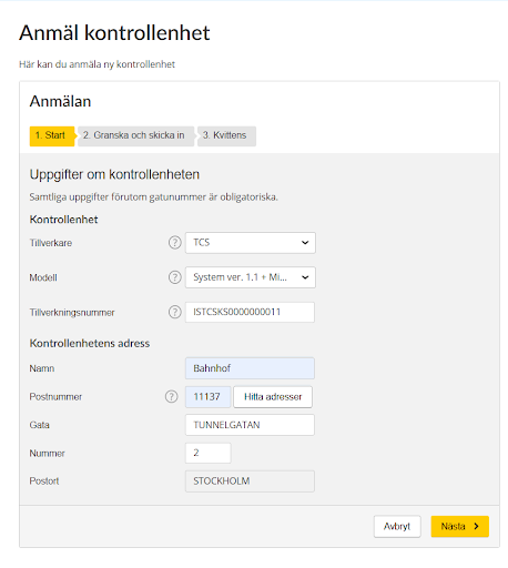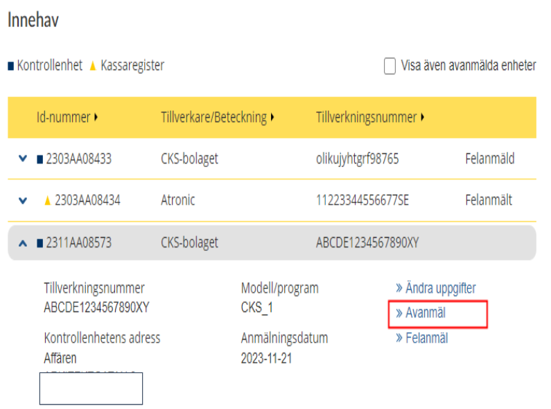 Här registrerar du nya kontrollenheter/kontrollsystem och kassaregister. Om du redan har registrerat kontrollenheter/kontrollsystem och kassaregister kommer du att kunna se dessa i listan. Du kan också ändra, avregistrera eller felanmäla.