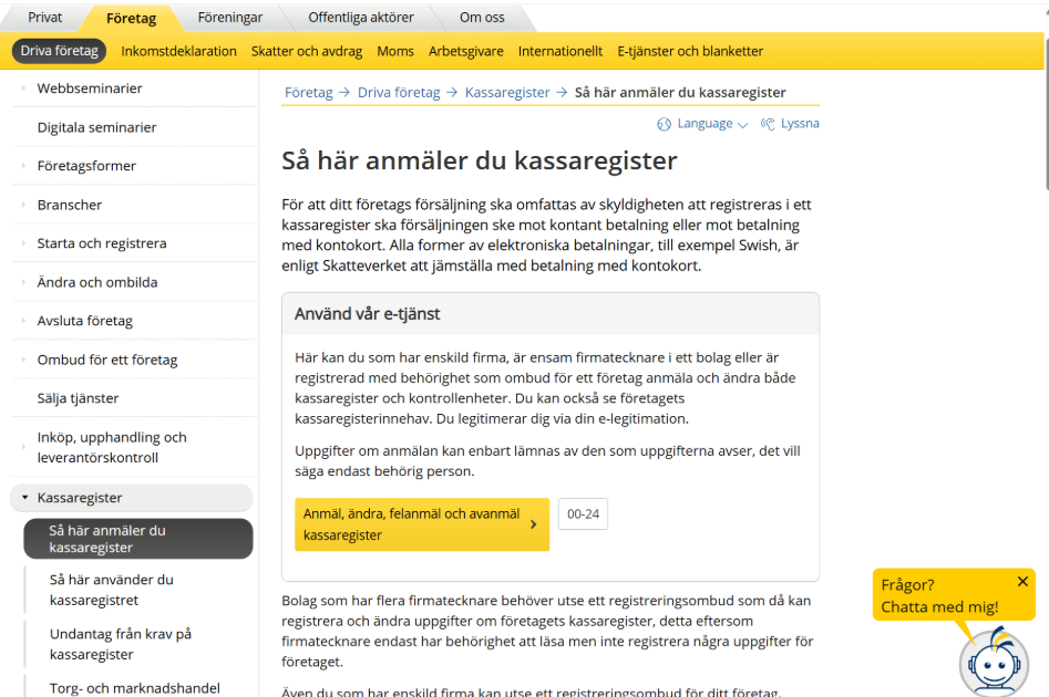 Logga in i e-tjänsten Anmäl, ändra, felanmäl och avanmäl kassaregister som finns på Skatteverkets hemsida.