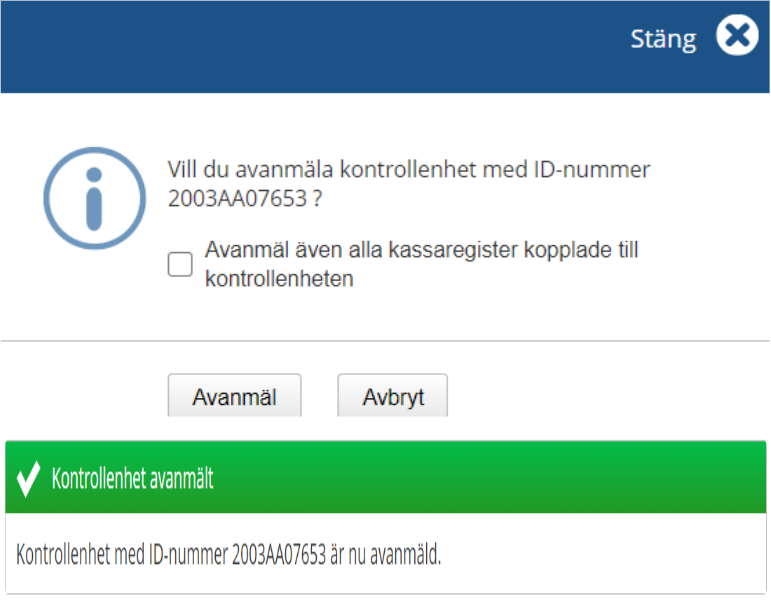 Därefter får du en bekräftelse på att kontrollenheten har avanmälts.
