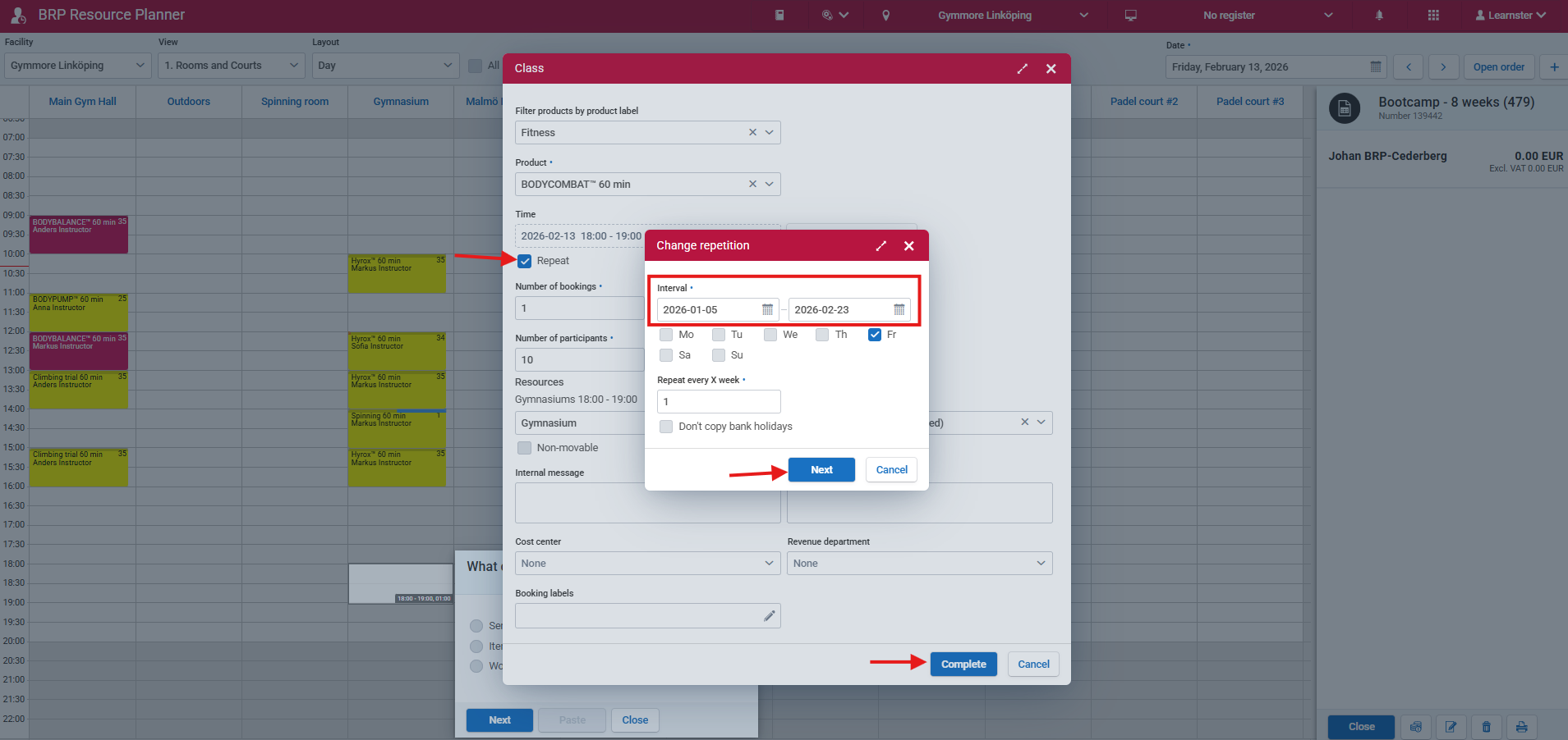 When you have verified that all necessary information is correct (product, time, resources), click Next and complete the booking. This will add all bookings to Resource Planner. All participants who join the event will then be automatically added to the participant list for all connected bookings.