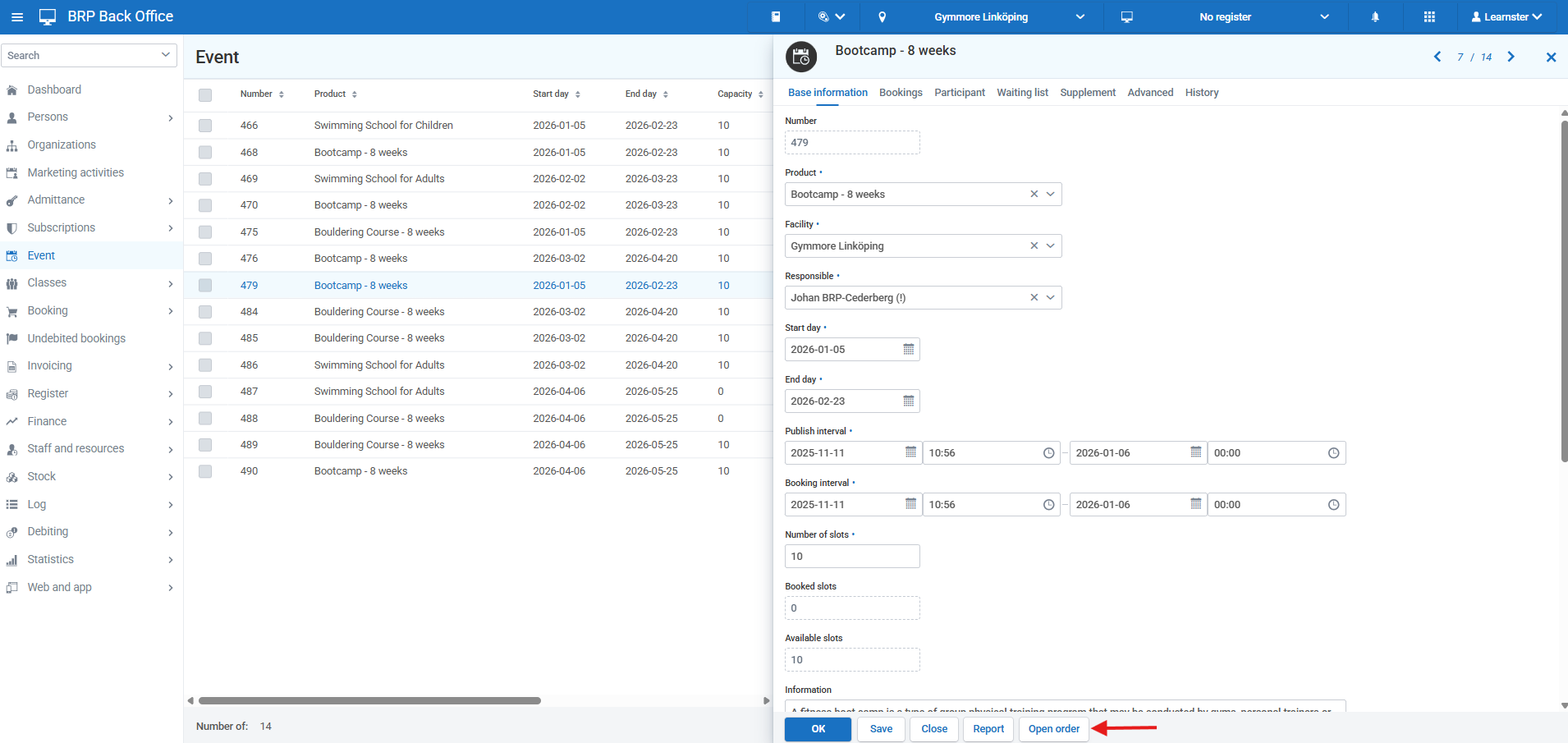 To be able to add an event in Resource Planner, the event must have bookings connected to it. To do this, go to Back Office > Events and open the event. Click the event and then click Open order.