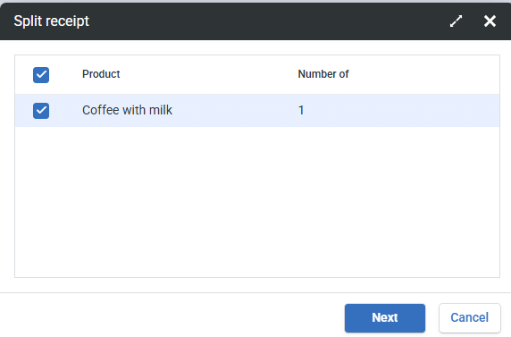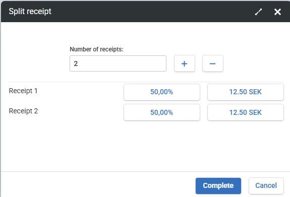 Choose the number of receipts you want to split it into and set the amount for each receipt. You can change the preselected percentage or amount by clicking on it and entering the desired percentage or amount.