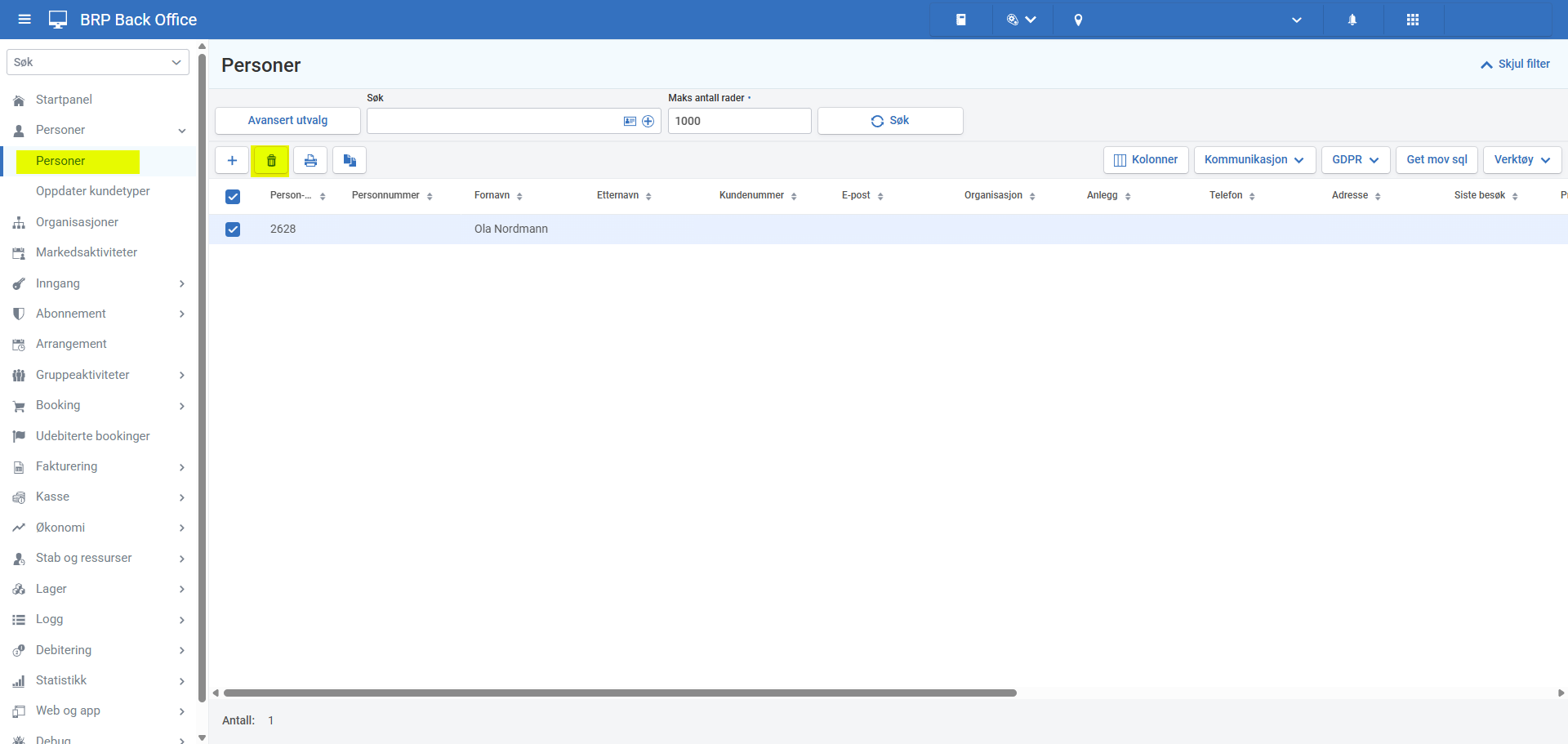 Gå til Back Office > Personer. Søk frem personen du vil slette
