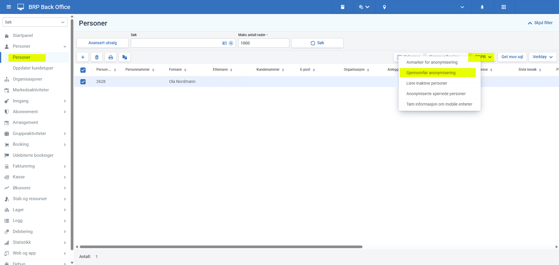 Klikk for større bilde Personen er nå merket for anonymisering, men er ikke slettet ennå. For å slette personen må du nå klikke på "GDPR" og "Gjennomfør anonymisering". For å kunne gjøre dette må din rolle ha rettigheten "Personer - Gjennomfør anonymisering".